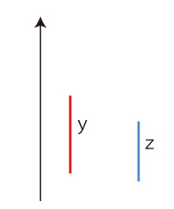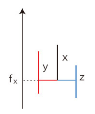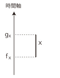 図の構成は,形式的構成である。 過去・現在のすべてのヒト個体を考える。 個体xに,xの出生時刻 fx と死亡時刻 gx の対 ( fx, gx) を対応させる。 xが現在の個体の場合は,現在の時刻を gx とする。 時間軸を立て,xをつぎのように図表示する (横軸は不定としておく(註)): ![]() 性別を込めて表すときは,「女 : 赤,男 : 青」とする : ![]() 個体xが個体y,zをそれぞれ母,父として産まれたことを,つぎのように表す: