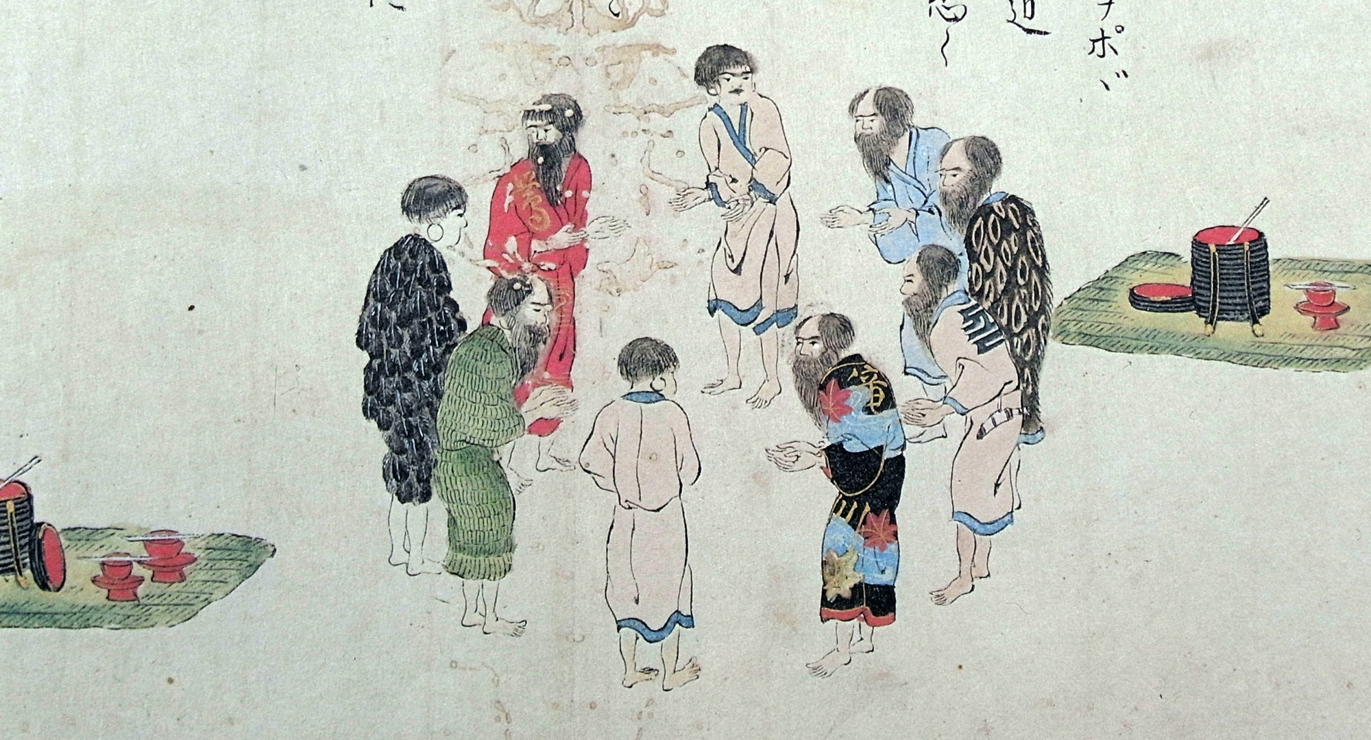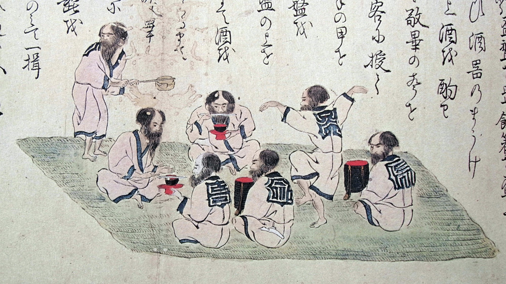 先、文席(アヤキナ) (ガマで編んだ花ゴザ) を敷、客相對して両人の中央に行器(ケマコルシントク) 酒を湛如し柄杓を添る (ドウキ)(タカイシヤラ)を置、飲箸(イクパシ)を盃上におきて、客数人にしたかひ酒器のまうけ如圖。