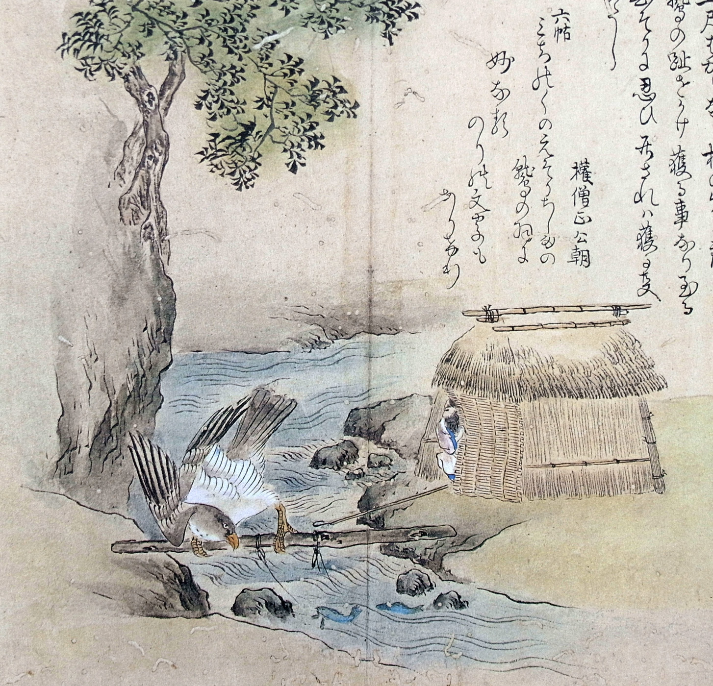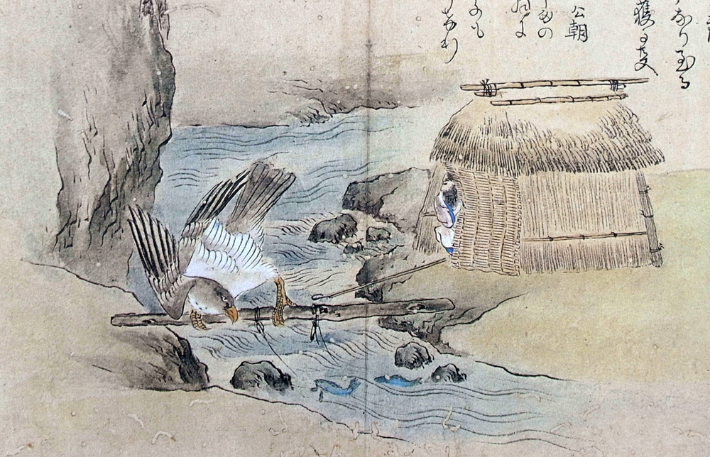 魚のはねるを見て鷲来りとらんとする所を、五尺はかりなる杖の先に鍵を付置、鷲の趾をかけ、獲る事なり。