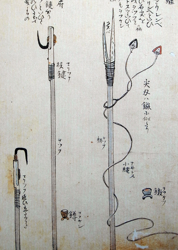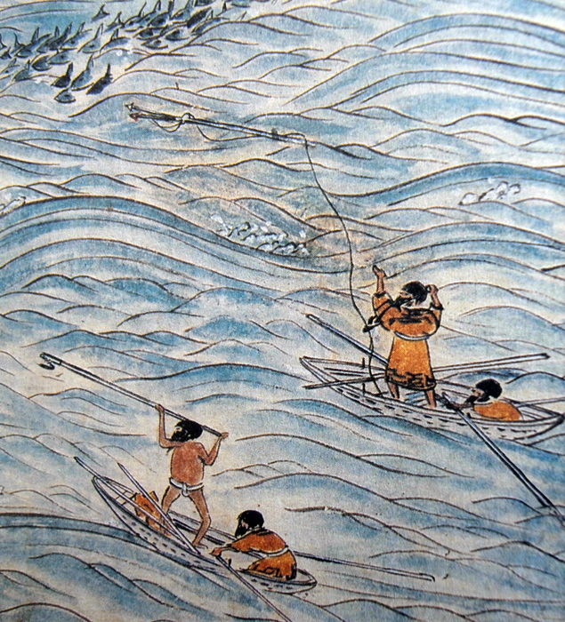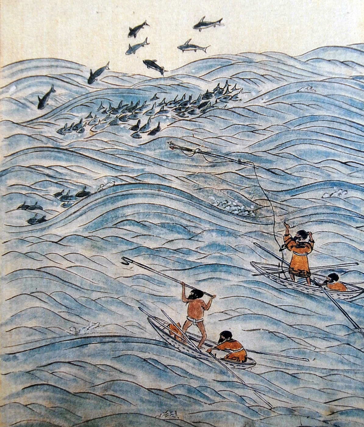 ‥‥ こゝらの黒魚(タンヌ)(いるか)、沖もせに群れ行が行あらそひ、波を離れて五六尺(いつさかむさか)斗も飛あがるを見て、ハナリ撃てんとアリンベ (一本銛) にギテヰ(銛頭)てふものをさし、アヰドスとて細き縄をギテヰに付て、(から)もひとつにとりもて、ぬかにこれをさしかざし、たちねらふにおぢて浪のそこにしづみかくろふを見て、あなねたしとて船追ふ。