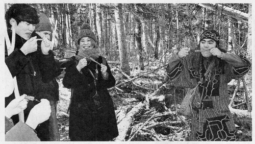 モニターツアーでは、伝統楽器のムックリ (口琴) を全員で奏でたり、滝口さんがシラカバの樹皮を着火材にして火をおこし、「煙にはカムイ(神)の世界に通じる意味が込められている」と解説したりした。