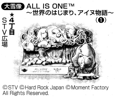 4丁目会場のアイヌ神話をモデルにした大雪像 (高さ12メートル、幅20メートル、奥行き15メートル) で行われたプロジェクションマッピングは、アイヌ民族に伝わる人文神「アイヌラックル」の誕生秘話を、約3分間の映像に音楽や語りを交えて幻想的に再現。訪れた家族連れらは神話の世界に引き込まれていた。