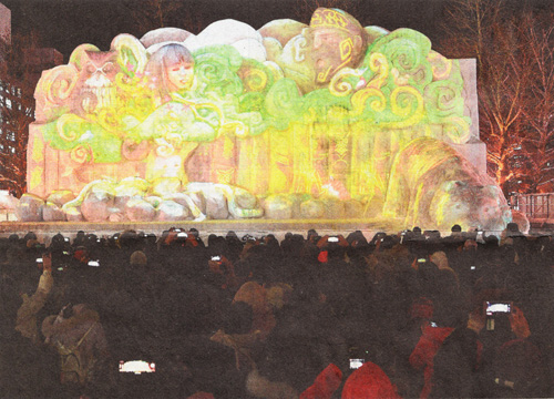 | 大通4丁目にはアイヌ神話をモチーフにした大雪像が完成。夜には映像と音楽によるプロジヱクションマッピングも行われる (3日午後撮影) |