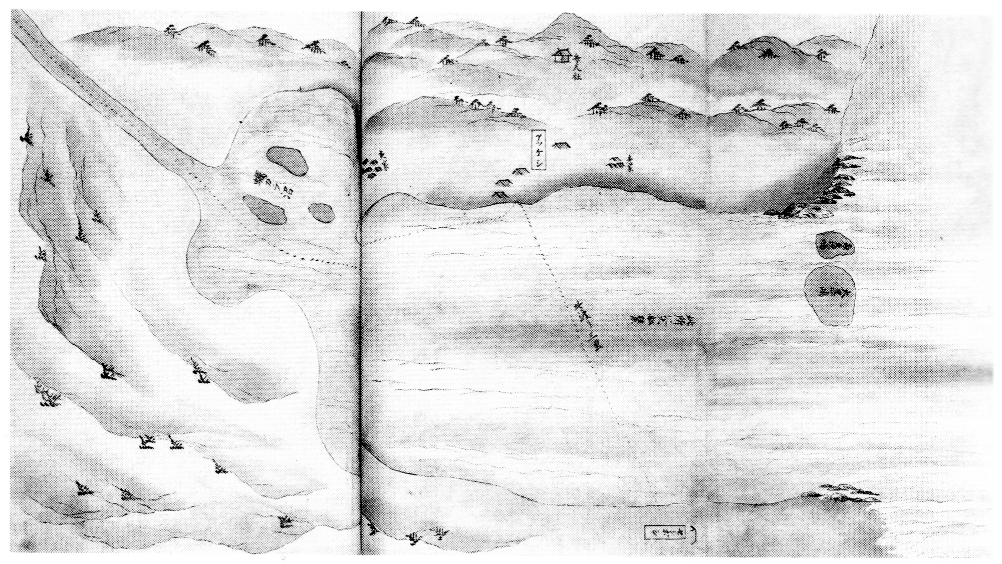 一、當アツケシの儀は東蝦夷地第一番の大湊にして、未申をうけ、澗口に大黒嶋、恵比壽しまとて小嶋あり。