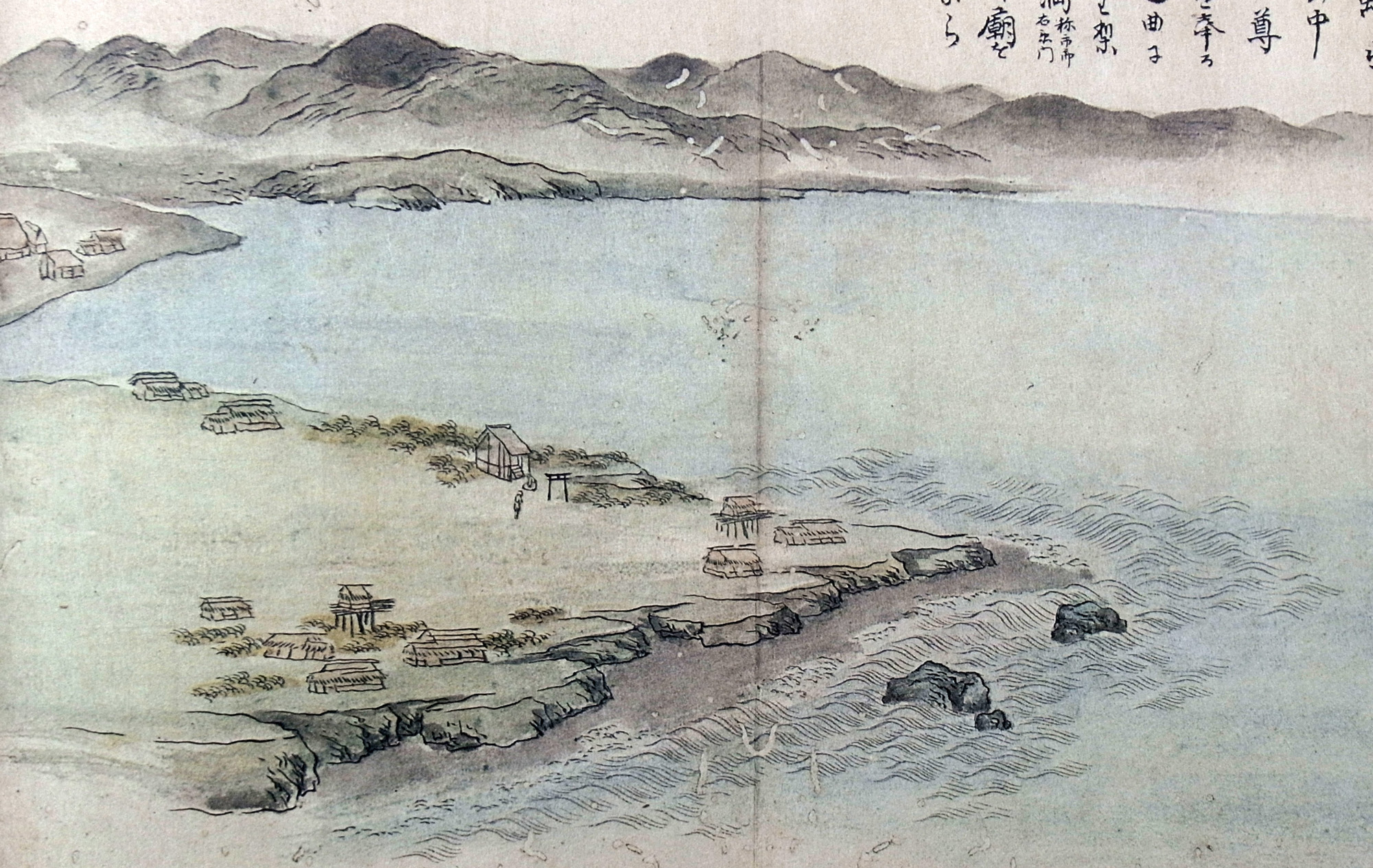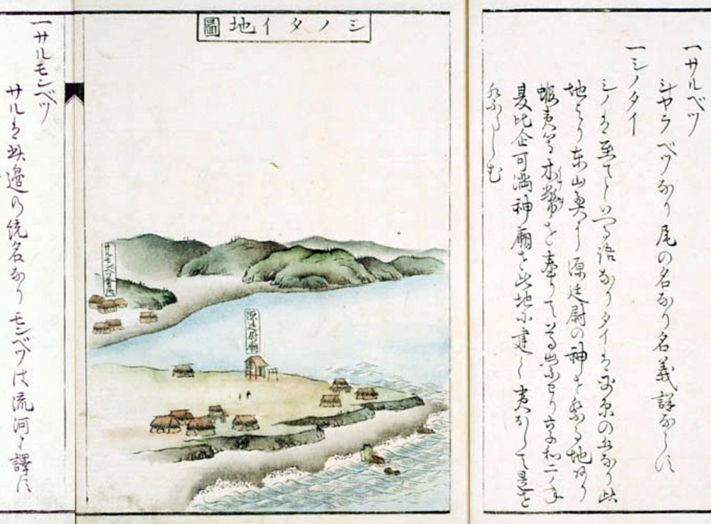 上図中央の鳥居のある祠が「源廷尉廟」,そして図左端の入江の対岸の建物が「サルモンベツ会所」。