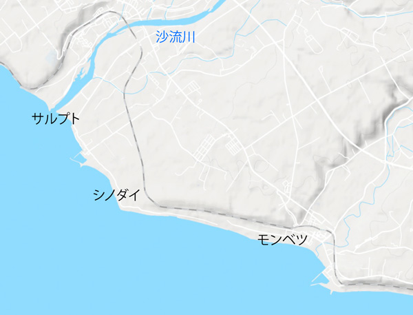 上二図は,下の地図 (Googleマップから引用・文字情報消去) で,サルプトの方からシノダイ,モンベツを見通すふうになっている: