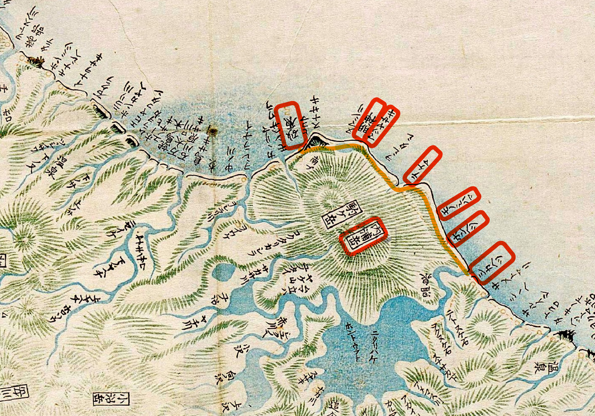 見やる沖の流れ洲のやうなる、布一むらを、うなゝかに引わたしたらんかとさし出たるを砂埼とて、エドモの浦(室蘭)に舟路のいと近し。
