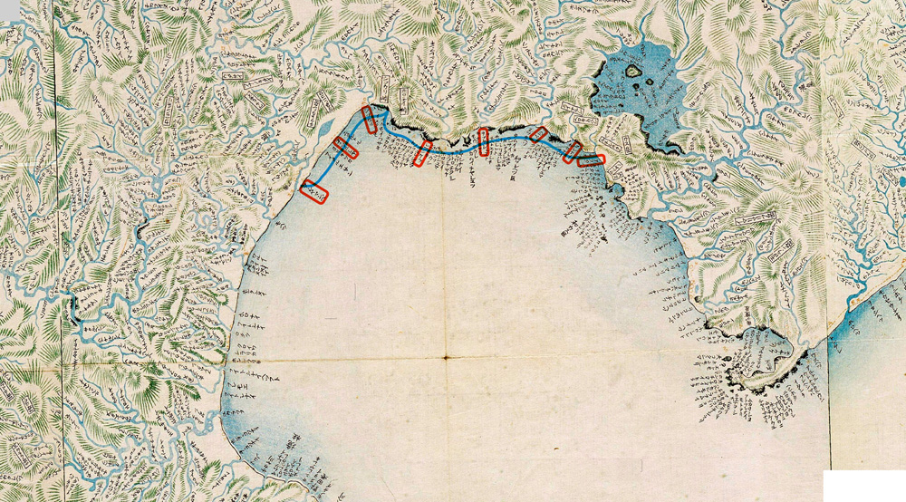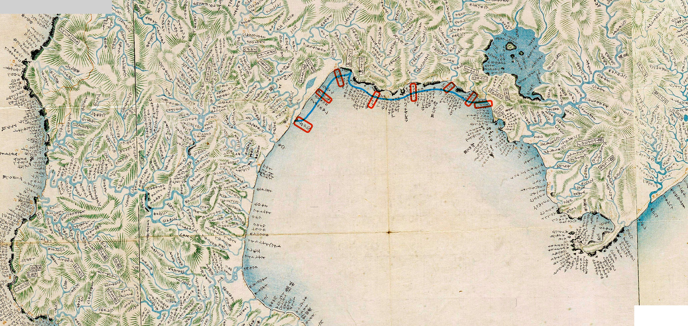 蝦夷の栖家は八十(ばかり)もありといふが、浜辺、あるは林の中にも見えて、やゝ日もくれはつる空の、くもりもなう、波の千里もしづかに、いとおもしろきゆふべ也。