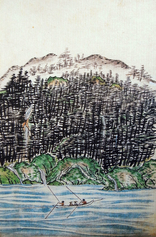 やがてこゝを搒出れば、巌の姿ことにおもしろく、蝦夷椴(フツプ)(トトロツフ, とどまつ)、あるは蝦夷檜木(シユング)(エゾマツ)の生ひまじりたてるは、人の作りなせるがごとし。