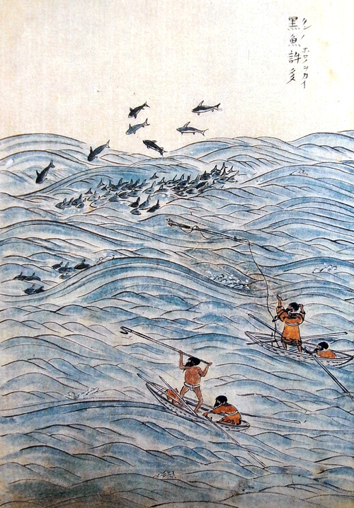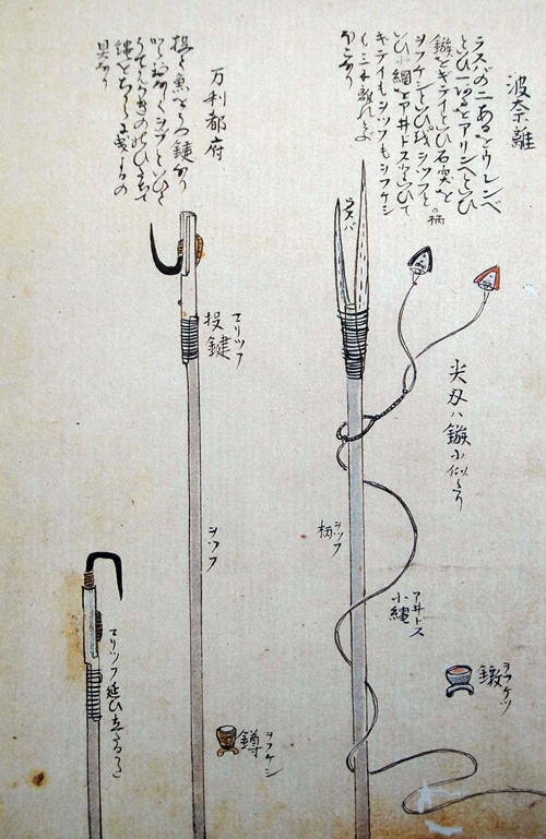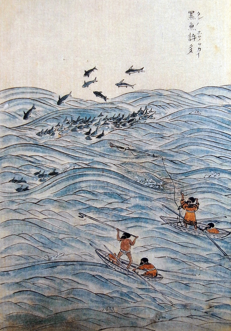舟のアヰノら葛筥(サラネフ)のなかより、おほふゝきの葉につゝみたる鱒魚,ブヰなど取出して、ひたにくひて、ニヤトスの(ワッカ)ひたのみにのみカンヂとらで休らふほどに、こゝらの黒魚(タンヌ)(いるか)、沖もせに群れ行が行あらそひ、波を離れて五六尺(いつさかむさか)斗も飛あがるを見て、ハナリ撃てんとアリンベ (一本銛) にギテヰ(銛頭)てふものをさし、アヰドスとて細き縄をギテヰに付て、(から)もひとつにとりもて、ぬかにこれをさしかざし、たちねらふにおぢて浪のそこにしづみかくろふを見て、あなねたしとて船追ふ。