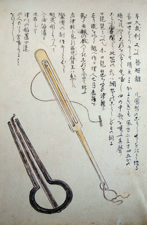 こは、いかなる音なひかといへば、あるじ、シャモは口琵琶といひ、アヰノは是をムクンリといひて、五六寸(いつきむき)ばかりの網鍼(あばり)のごとく、竹にて作りたるものなり。