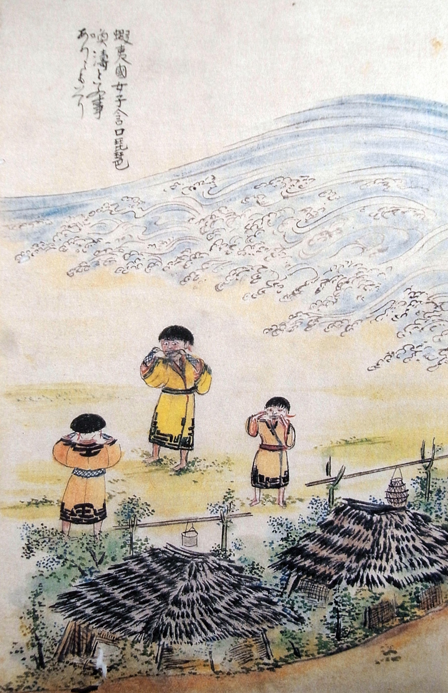 舟漕ぐ二人の蝦洟人(アヰノ)暑さにたえず、シャモの(イタク)醼裞衣(サカカタビラ)とて、もろこし織の木緜布(センガキ)をいろいろ衣の如く染さして、又繍したる衣もアツシの衣着たるもみなぬぎやりて、舳□(ともへ)にしりうたげして、けぶり吹やるアヰノの身は、墨ぬり、うるしさしたるばかり黒きむくろに、雪の降たるやうに、おどろのしら髪ふりみだしたり。