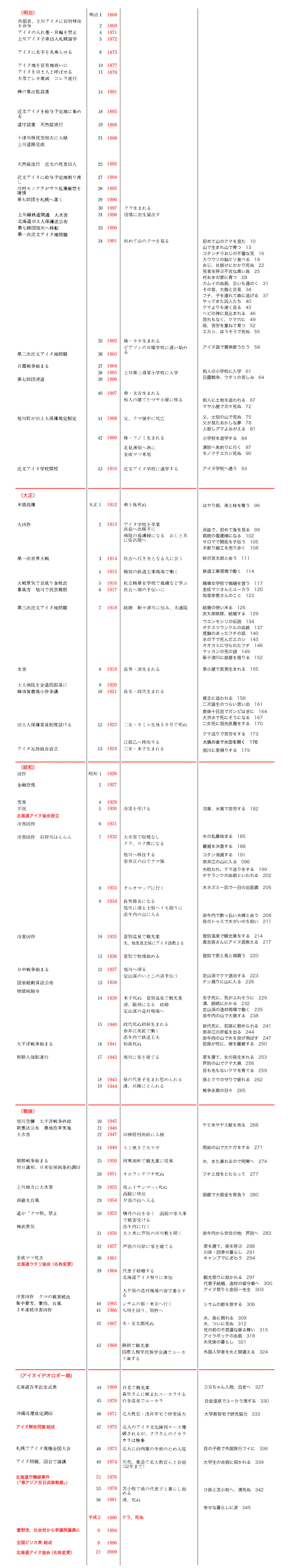 砂沢クラ著『ク スクップ オルシペ 私の一代の話』(北海道新聞社, 1983), pp.349-353 の表 (「クラさんの暮らしと同時代史」) に,対応する本文の節の標題, 頁を書き加え,さらに朱色でメモを追加した: