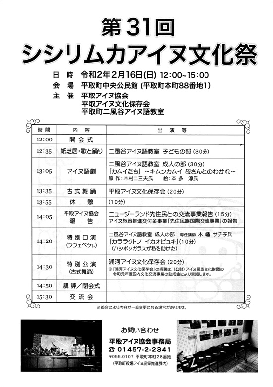 同町観光協会では「沙流川流域の豊かな自然と共に培われたアイヌ文化と歴史に関心を寄せ、また、平取町の魅力を再発見してほしい」などと参加を呼びかけている。問い合わせは同町観光協会 (01457・3・7703) ヘ。