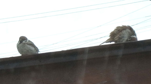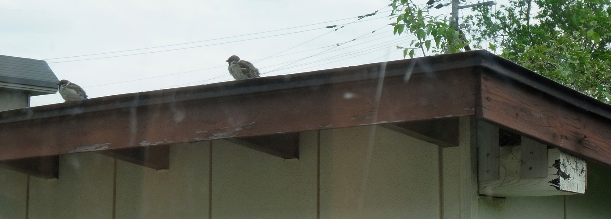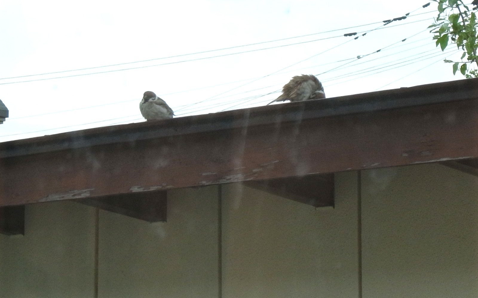 二羽のスズメが,巣の上の屋根にいるのを見る。