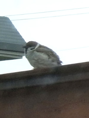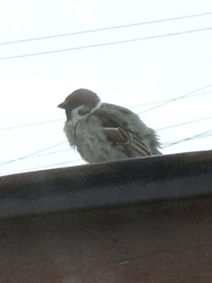 毛がぼざぼざしているふうは子どものスズメみたいだが,くちばしの黒いこと,喉の黒い模様から,成鳥である。