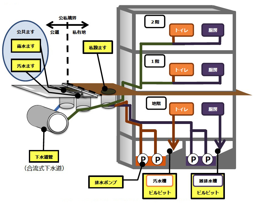 厳重に扉を閉め切って浸水が無いようにしているつもりでも,津波浸水はある。 地下空間建造物には,雨水等浸水に対応する貯留槽や,ビルであれば汚水排水槽 (ビルビット) が設置される。 この槽の内容物は排水ポンプで下水道管に流される。 この設備が,津波浸水の経路になる。 即ち,津波の水が下水道管から地下空間へ逆流してくるのである。 その水量は,下水道管を逆流する津波の圧力で決まる。 下水道管と通じている排水管が細くても,水流がその分強くなるということであって,浸水量が少ないとはならない。 |