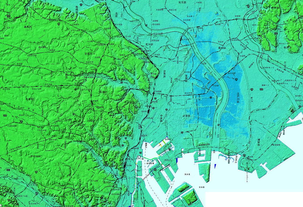 地図の右半分が河口の河原で,左半分が河岸段丘の台地 (「武蔵野台地」) である。