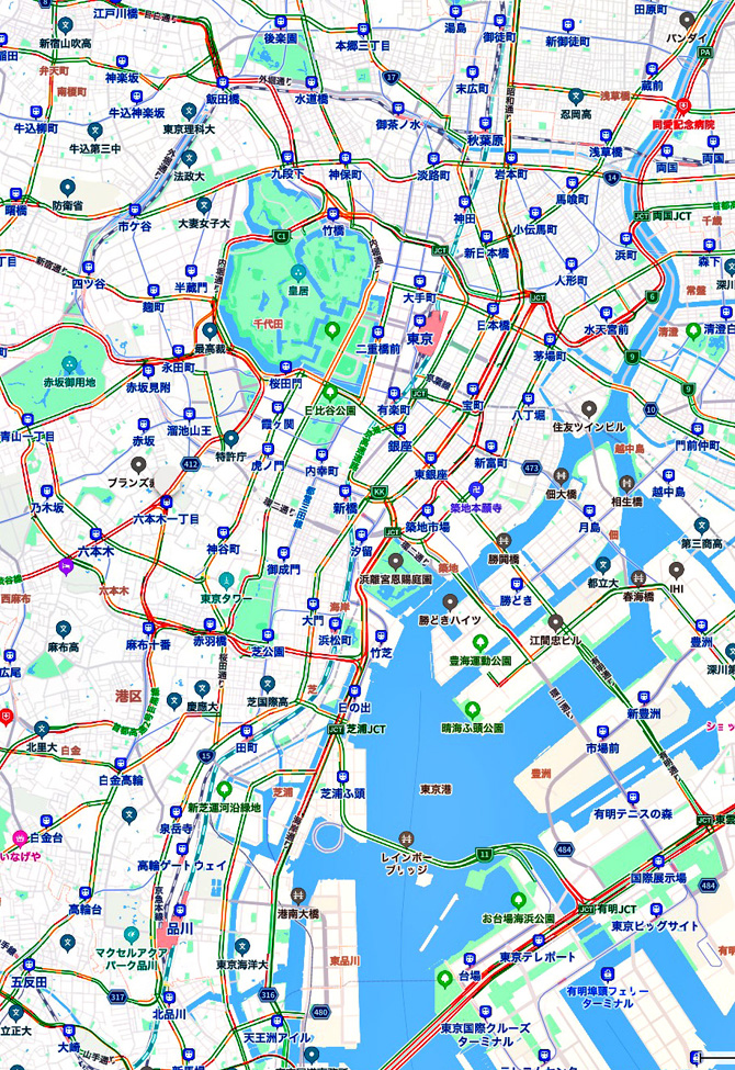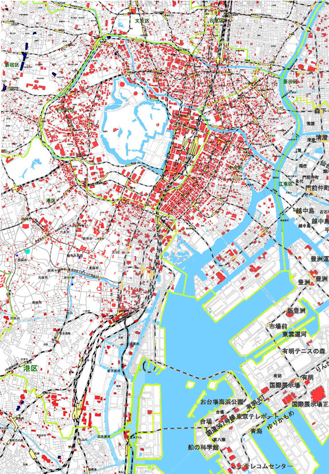 実際,つぎは地下階がある建物を赤色で示したものであるが,その地下階の多くは地下道路・地下街に通じ,そしてそれは地下鉄に通じている: