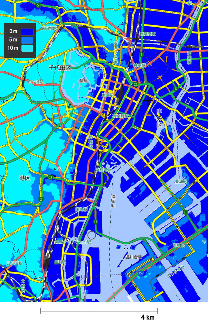 つぎの地図に示される標高0m, 5m の地帯は,津波が防潮堤を越えるとたちまち浸水することになる: