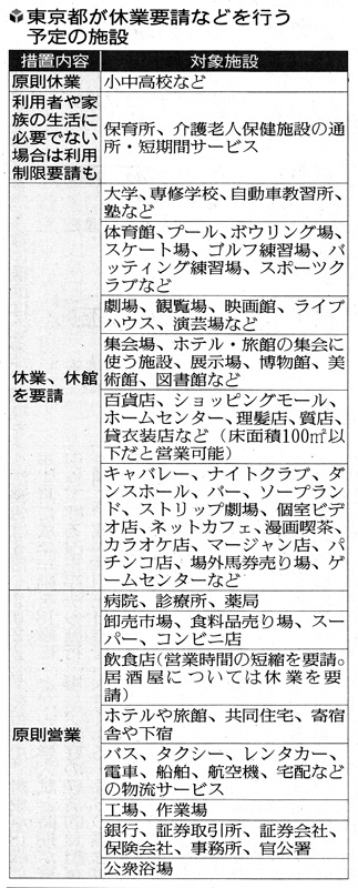 緊急事態宣言の発令に備え、東京都が6日にまとめた施設や事業者への休業要請などの対処方針は、感染が広がるナイトクラブなど様々な施設に幅広く網をかけた一方、公共交通機関などの機能を維持することを強調した。 都民のパニックを避けながら感染拡大を食い止めようとする危機感が反映された。