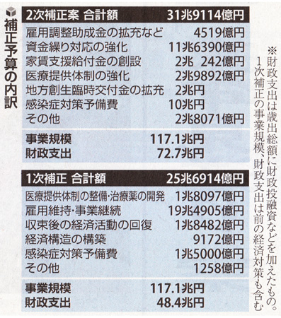 1次補正と2次補正の事業規模の合計は233.9兆円で、国内総生産(GDP) の約4割に相当する。
