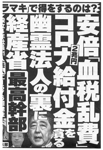 ![]() 自粛警察に邁進の週刊誌なので病理オンチはわかるが,財政にもひどいオンチというわけだ。 今日「血税」がどんなことばになるかを見るために,少々数値を引いてみる: 日本の財政は,もうずいぶん前から「税金で賄う」でないのである。 「血税」は,とっくに死語である。 週刊誌ならさもありなんでよいが,何を考えているものやらわからないのが国会の野党である。 上に挙げた数値の類はしょっちゅう見ているはずなので,いまさら「税金」がどうのとは言わないと思われるし,実際,財政出動に対しては破格の要求を出してきている。 野党からの要求を全部受けていたら「121.1兆円」どころの話ではない。 「恐慌を免れるために,世の中を金でジャブジャブにしておく」においては野党も同じ立場,と考えることになるのである。 さて,この「ジャブジャブにする」は,面倒な手続きを踏んでいたら進まない。 面倒な手続きは,人手もシステムも大変になるのである。 即ち,めちゃくちゃは,めちゃくちゃなやり方で実現することになる。 よって,めちゃくちゃなやり方には,目をつぶることになる。 ところが,つぎのような話になってくる。 で,先の「何を考えているものやらわからないのが国会の野党」のことばとなるわけである。