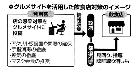 政府は月内にも、飲食店が新型コロナウイルスの感染対策をきちんと講じているか、グルメサイトを使って監視に乗り出す。 店の利用客にアンケートに答えてもらい、対策が不徹底な店が見つかれば、都道府県に改善を指導させる。