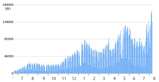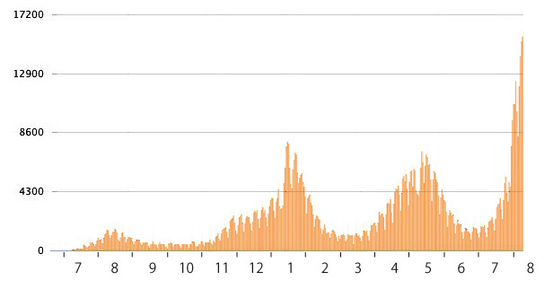 検査件数はつぎのように推移している (いまは, ひと月前の倍以上):