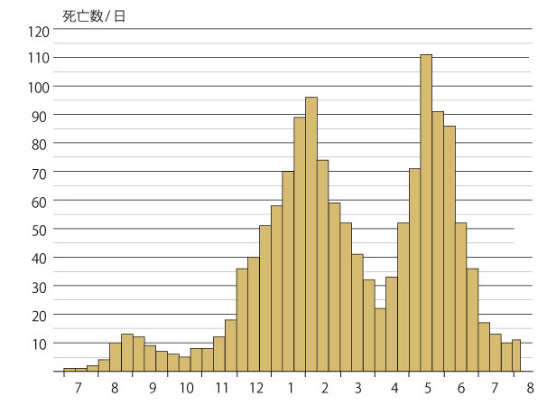 ところが,「1日あたり死亡数」の推移 (10日おき) は,つぎの通り(註)