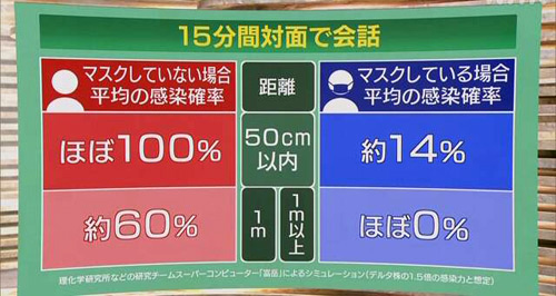 一方、感染者がマスクをしていない場合は1メートルの距離でおよそ60%、50センチ以内の距離ではほぼ100%となりました