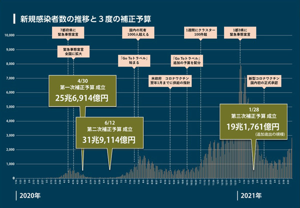 東日本大震災の復興予算が、10年あまりの総額で約32兆円であることからも、“コロナ予算” がいかに異次元の規模かがわかります。