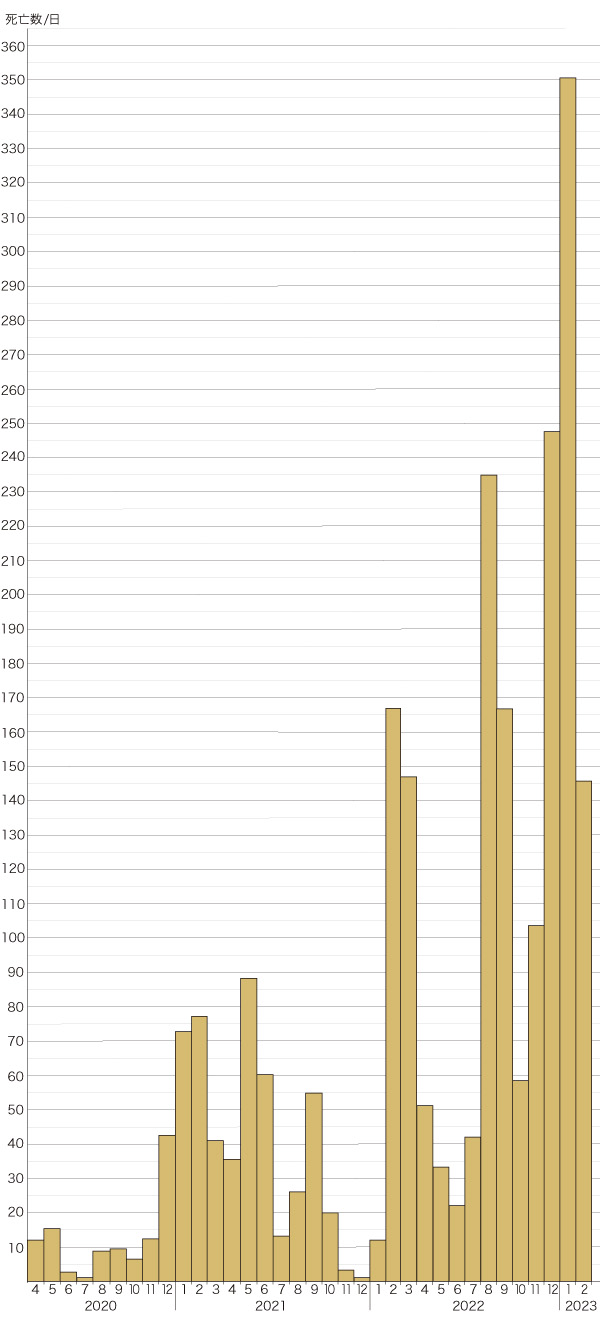 Up 死亡数の推移 (累計と1日あたり) : 2023-02-28 まで 作成: 2023-03-02