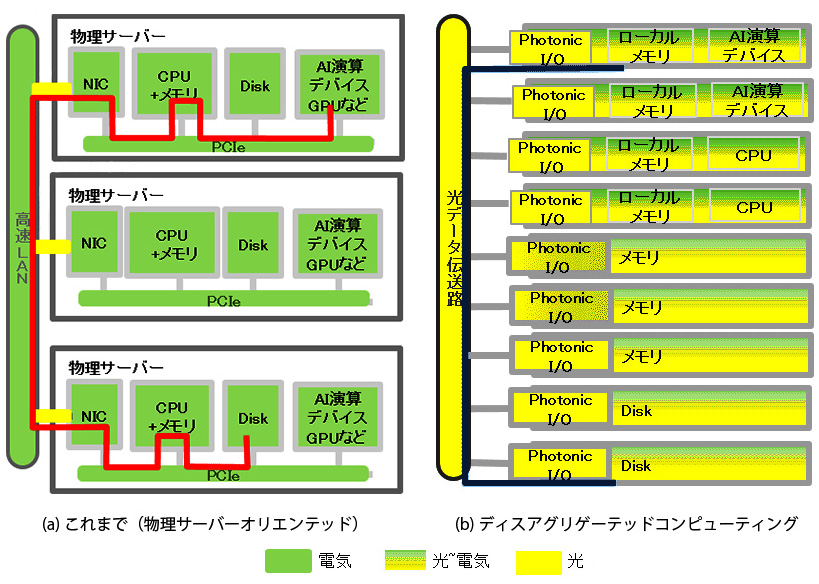 インターネットがあたりまえの現代は,専用回線もグローバルでなくては話にならない。 こうして「専用回線の挽回」は,インターネットとパラレルに,光専用回線のグローバルネットワークをつくることである。 実現することになるのは,国際電話網の「デジタルデータ光通信」版である。 IOWN の成否は協賛グループを世界的に拡げられるかどうかにかかっている,というわけ。 実際,上の PR は,ハイグレードなグローバル光専用回線の PR ではなくて,これの開発で基本技術の1つとなっている「光電融合技術」の PR である。 IOWN の協賛グループに,マイクロソフトが加わっている。 インターネットにつながってナンボのマイクロソフトがなぜ「専用回線」か?と一見不思議に思うが,マイクロソフトは「光電融合技術」に惹かれているわけである。 今年の9月20日に,スリーマイル原発運転再開後の電力をマイクロソフトが 20年間全量を買い取る契約をしたことが,報じられた。 この契約は,電力をバカ食いするデータセンターの運営のためである。 データセンターを運営する企業は,コストを減らせる技術が欲しい。 そこで「消費電力100分の1」 「大容量」 「低遅延」 が魅力になる。 つぎが,「光電融合技術」が適用されたデータセンターの概念図である: |