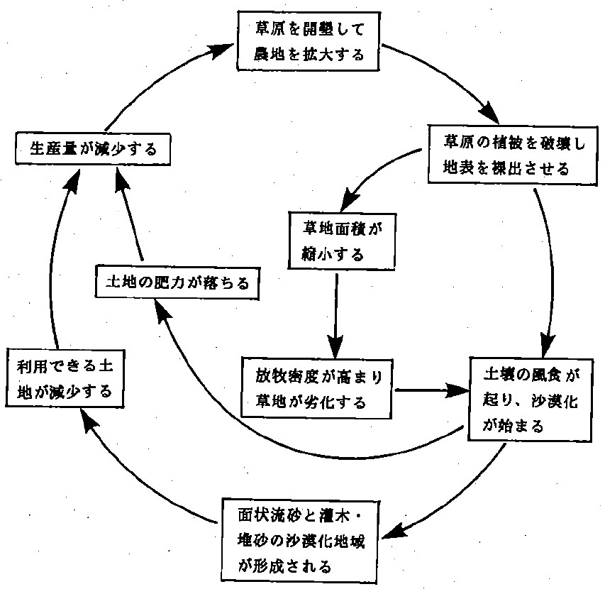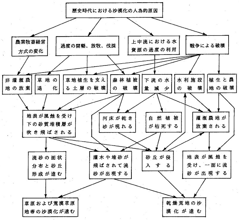 中国科学院蘭州沙漠研究所の朱震達・劉恕氏らの報告によれば,中国の沙漠は,歴史時代lに形成されたもの 12万km²,最近の半世紀に形成されたもの 5万km²• さらに潜在的な沙漠化地域が 15.8万km² あり,合計 32.8万km² に達するという。