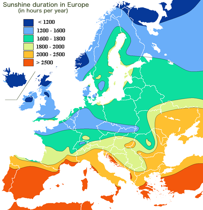 地中海に面している地域の日照時間「>2500時間」は,日照率に換算すると「>57%」である。