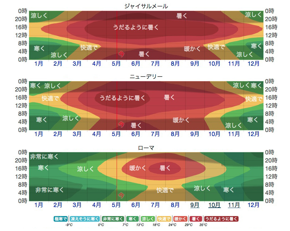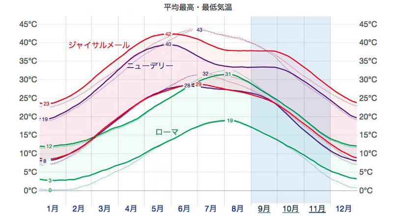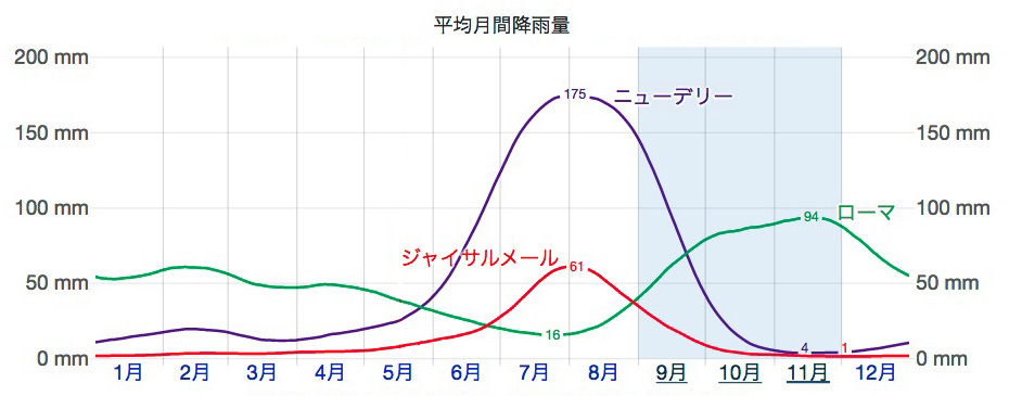 サバク域に入っているジャイサルメール,入りつつあるニューデリーの気候は,つぎのようになっている(比較としてローマを加える): |