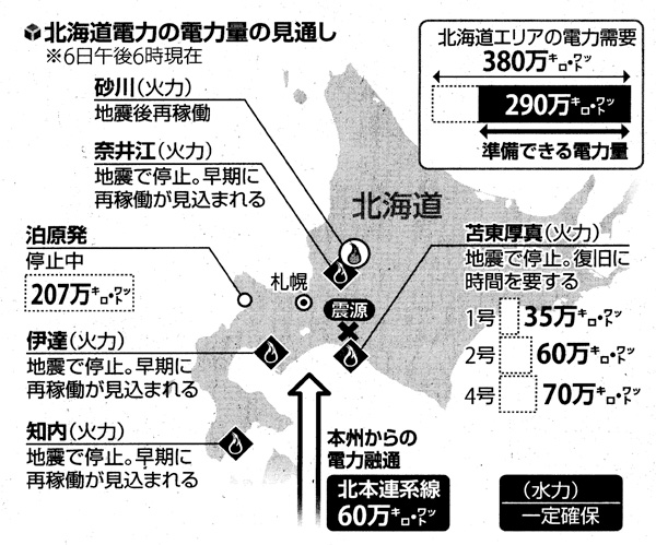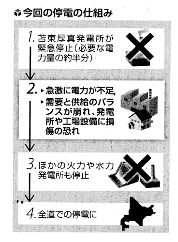 6日午前3時過ぎに地震が発生した直後、震源地近くの苫東厚真火力発電所が緊急停止した。1、2号機から蒸気が漏れ、4号機はタービン付近から出火した。同発電所の発電能力は 165万キロ・ワット。道内の使用電力の約半分を供給する電源が失われると、数分以内に他の火力発電所も次から次へとドミメのように停止した。道内のほぼ全世帯で電気が使えなくなった。全国で電力の需給調整を行う認可法人「電力広域的運営推進機関」によると、大手電力会社の管轄の全域で停電するのは初めてのケースだ。