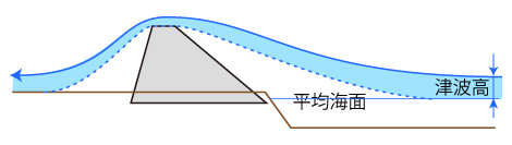 津波は,岸に近づくにつれ高さを増し,防潮堤の前ではさらに高くなり,そして防潮堤を越える。 防潮堤を越えてから以降は,なめらかな安定した流れになる。 これは,流れる水の下に水の台ができた格好である:
