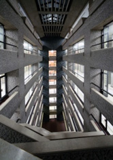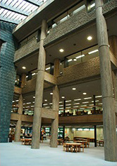 中央に、地下最下層まで外光が届くよう、光庭が設けられているのが特徴です。垂直・水平コンベアも設けられています。地上部分は西半分の事務室と、東半分の閲覧スペースが、はっきり分離されています。