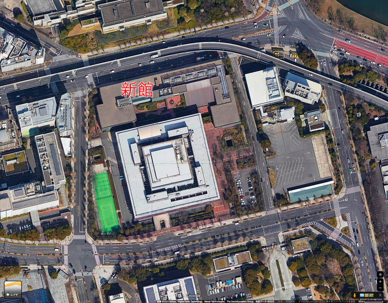 新館は本館の北側に隣接した、東西約148m、南北約43mの細長い建物です。本館と有機的に結びつくように設計・建築されました。地上4階、地下8階建てで、延面積は約72,900平方メートルになります。地下1階から地下8階の地下部分は全て書庫です。750万冊の資料が収蔵可能で、書架の総延長は約240kmに及びます。