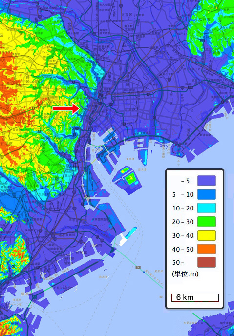 どのくらいの水量で上るかは,単純には惰性で上るベクトルと等高に拡がろうとするベクトルの兼ね合いであり,要は津波の強さ次第。しかし,あちこちに向かう流れの相互干渉があるので,実際に起こってみなければわからない。