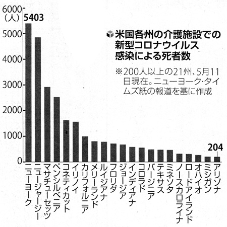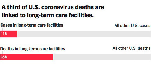 ニューヨーク・タイムズ紙の集計 (5月11日現在) では、全米約7700ある長期滞在型施設の入居者と施設職員の約15万3000人が感染し、少なくとも2万8100人が死亡した。