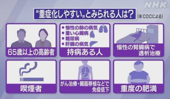 重症化しやすいとみられる人として、アメリカのCDC=疾病対策センターは65歳以上の高齢者に加えて、慢性の肺の病気や、重い心臓病、糖尿病、肝臓の病気などの持病がある人のほか、慢性の腎臓病で透析治療を受けている人、喫煙者やがんの治療や臓器移植などで免疫力が低下している人、それに重度の肥満の人などをあげています。