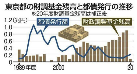 都はバブル経済崩壊後の1990年代に深刻な財政危機に陥った反省から財政再建に取り組んできた。一時は都債(借金)を1年で1兆円以上発行する状態だったが、近年は多くても2000億円台に抑制。都債残高は7兆6000億円規模から5兆円を切るまでになった。