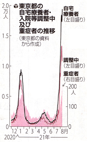 感染者の急速な増加に伴って重症者も急増しており、40歳、50歳代を中心に、都基準の重症者は197人と、2日連続で過去最多を更新した。
