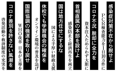 世界を不意打ちした新型コロナウイルスは、日本で900を超える死者を出し、経済・社会活動を様々な形で止めた。国民の間に大きな不安を広げている。私たちは、これまで盲点となっていた感染症というリスクとしっかりと向き合わなければならない。読売新聞社は、感染症に強い社会を築くための処方箋として、7項目の緊急提言をまとめた。