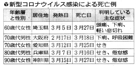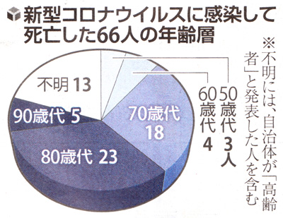 新型コロナウイルスの感染者で3月末までに国内で死亡した66人 (クルーズ船の死者を除く) を分析したところ、少なくとも7割の46人が70歳以上で、25人には何らかの基礎疾患があったことが読売新聞の集計でわかった。 発熱などの初期症状から2週間程度で死亡した人が多く、持病のある高齢者が急速に症状を悪化させるリスクが改めて浮き彫りとなった。