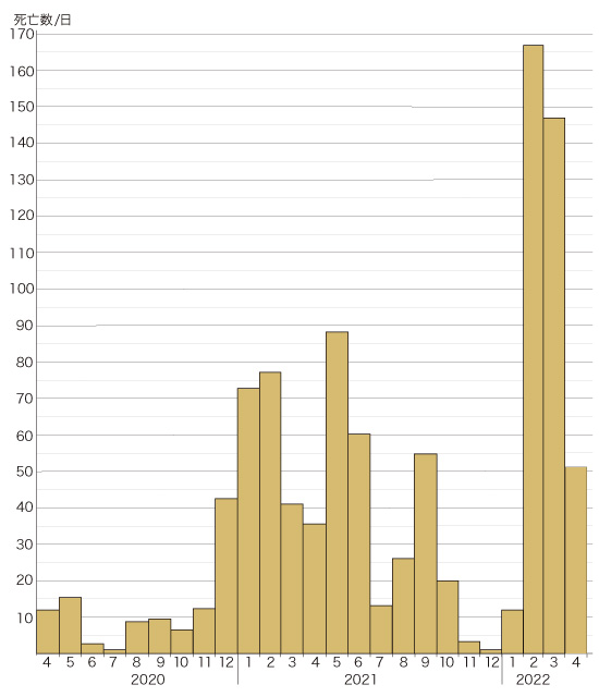 | Up | 死亡数の推移 (累計と1日あたり) : 2022-04-30 まで | 作成: 2022-05-01 更新: 2022-05-01 |
