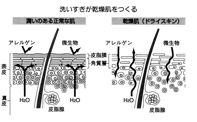 洗いすぎは皮膚常在菌を取り除いて、皮膚を中性にしているばかりか、皮脂をはがし、アトピー性皮膚炎や乾燥性皮膚炎を発症させる引き金となる。